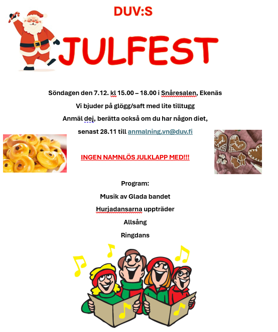Anmäl dej, berätta också om du har någon diet, senast 28.11 till anmalning.vn@duv.fi