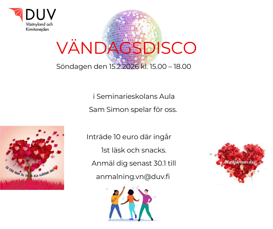 Vi ordnar vändags disco söndagen den 15.2.2026 klockan 15.00 – 18.00 i Seminarieskolans Aula.