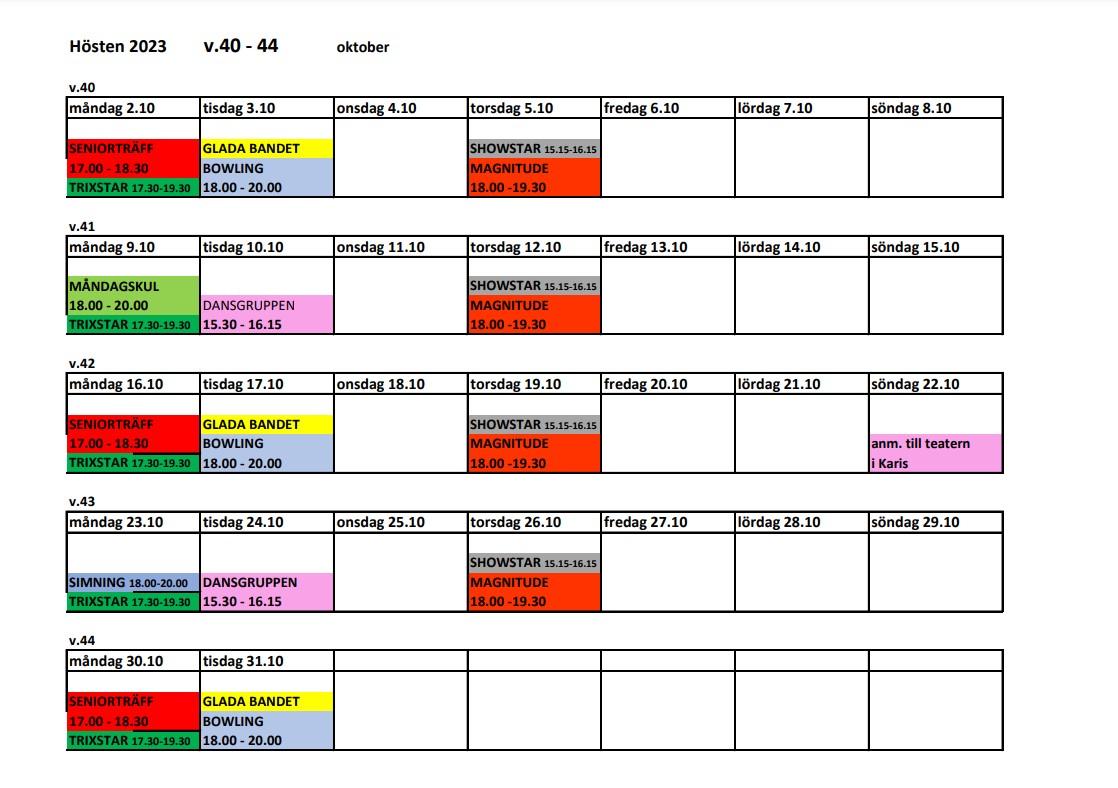 Programmet fortsätter som i September. Kom ihåg att anmäla dig till teatern Hemvärn och Påssjukan senast 22.10.