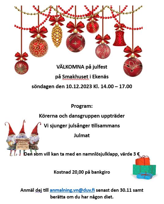 Anmäl dej till anmalning.vn@duv.fi senast den 30.11 samt berätta om du har någon diet.